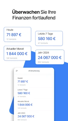 Med en intuitiv brugerflade gør eFakturering-app'en det muligt at oprette og sende fakturaer på under 30 sekunder. Det har aldrig været nemmere at dokumentere dine udgifter; tag blot et billede af kvitteringen direkte fra appen, og den gemmes sikkert. Appen giver dig et øjeblikkeligt visuelt overblik over dine salg og udgifter, så du altid er informeret om din virksomheds økonomiske situation. Den understøtter desuden alle tænkelige former for regnskabsdokumenter, hvilket sikrer fuld fleksibilitet for din forretning.