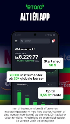 eToro åbner døren til en verden af investeringsmuligheder lige ved dine fingerspidser. Forestil dig at kunne udforske tusindvis af aktier fra 20 af verdens førende børser – alt sammen samlet på én intuitiv og brugervenlig platform. Uanset om du er en erfaren investor eller lige er begyndt din rejse, giver eToro dig adgang til globale markeder og de redskaber, du behøver for at opbygge en diversificeret portefølje med tillid.
