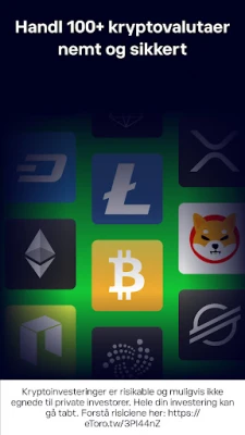 Udover aktier tilbyder eToro også en omfattende løsning for dig, der ønsker at handle kryptovalutaer. Med en dybdegående erfaring som en global fintech-pioner siden blokkædeteknologiens spæde start, kan du her erhverve dig Bitcoin, Ethereum, XRP og mange andre top-kryptovalutaer. Nyd fleksible indbetalingsmuligheder og handel uden indbetalingsgebyrer. Vær opmærksom på, at kryptoinvesteringer er forbundet med betydelig risiko og kan være yderst volatile – forstå altid de potentielle udsving.