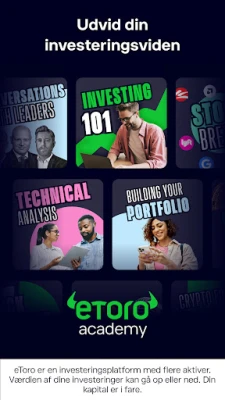 eToro er mere end blot en handelsplatform; det er et blomstrende fællesskab, hvor investorer kan mødes, udveksle idéer og dele strategier. Lær af andre, og find inspiration til dine egne investeringer. For at sikre, at du føler dig tryg, tilbyder eToro enhver ny bruger en virtuel portefølje på 100.000$, så du kan afprøve alle funktioner og markeder uden finansiel risiko. Desuden får du adgang til effektive handelsværktøjer som markedsresearch, teknisk analyse og ProCharts, der hjælper dig med at skabe overblik og træffe informerede beslutninger. Opret skræddersyede overvågningslister og modtag volatilitetsvarsler for at gribe nye trends.