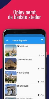 Glem alt om uventede roamingudgifter eller frustrationen ved mistede internetforbindelser. "Paris Offline & Byguider" tilbyder uovertruffen offline adgang til alt, hvad du behøver. Vores omfattende og detaljerede kort sikrer, at du altid bevarer din orientering og præcist finder din placering, selv uden et netværkssignal. Lokaliser ubesværet ikoniske attraktioner, charmerende restauranter, pulserende natteliv og komfortable hoteller. Med klare, intuitive rutevejledninger får du frihed til at udforske Paris trygt og i dit eget tempo, og opdage byens vidundere fuldstændigt uafhængigt af en internetforbindelse.