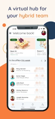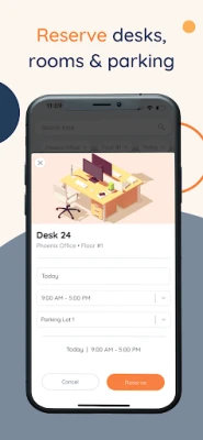 Denne brugervenlige software hjælper dig med at styre din kontortid effektivt. Book nemt skriveborde, mødelokaler og parkeringspladser. Et interaktivt kontorkort viser, hvem der er på kontoret, hvilket fremmer smidigt samarbejde med kolleger.