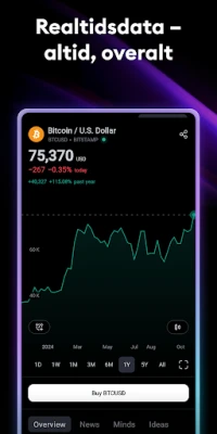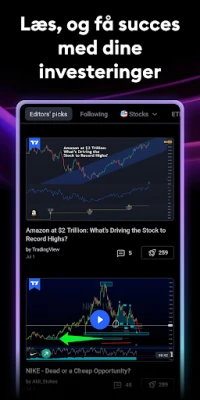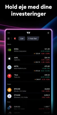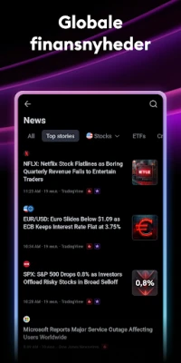 Dyk ned i markedet med TradingViews banebrydende diagramfunktionalitet, der sætter nye standarder for mobil analyse – ofte overlegent i forhold til traditionelle desktop-platforme. Appen tilbyder et kompromisløst udvalg af over ti forskellige diagramtyper, fra simple linjegrafer til avancerede Renko- og Kagi-diagrammer, der afslører prisdynamikker. Udforsk et omfattende arsenal af prisanalyseværktøjer, herunder et væld af indikatorer, strategier og tegneobjekter. Skræddersy dine overvågningslister til at reflektere dine investeringsfokus og opsæt intelligente realtidsadvarsler, der sikrer, at du aldrig går glip af afgørende markedsbevægelser, så du kan optimere dine handelsmuligheder.